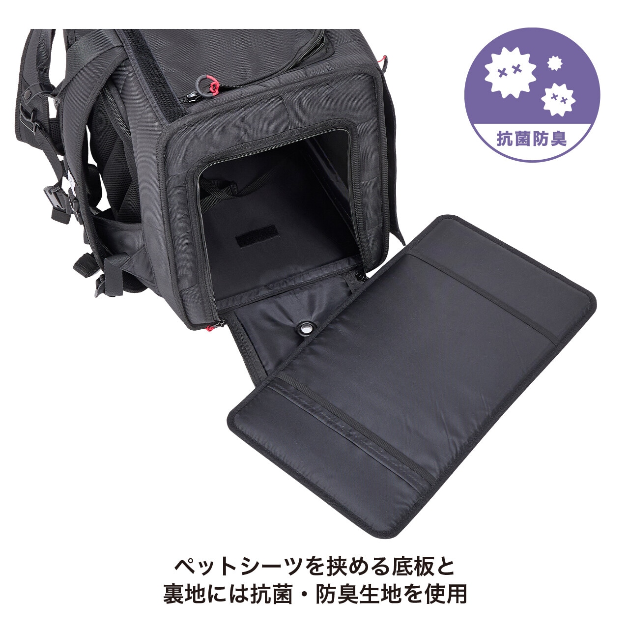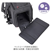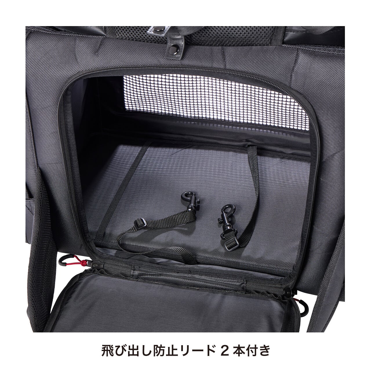 ・自分で出入りできるサイドオープン・生面に大きなポケット付き・飛び出し防止リード2本付き・天面はダブルメッシュ、フタ付き・背中部分は負担を軽減する本格的なクッション構造!胸・腰ベルト付きで安定感バツグン!・ペットシーツを挟める底板と裏地は抗菌防臭生地を使用