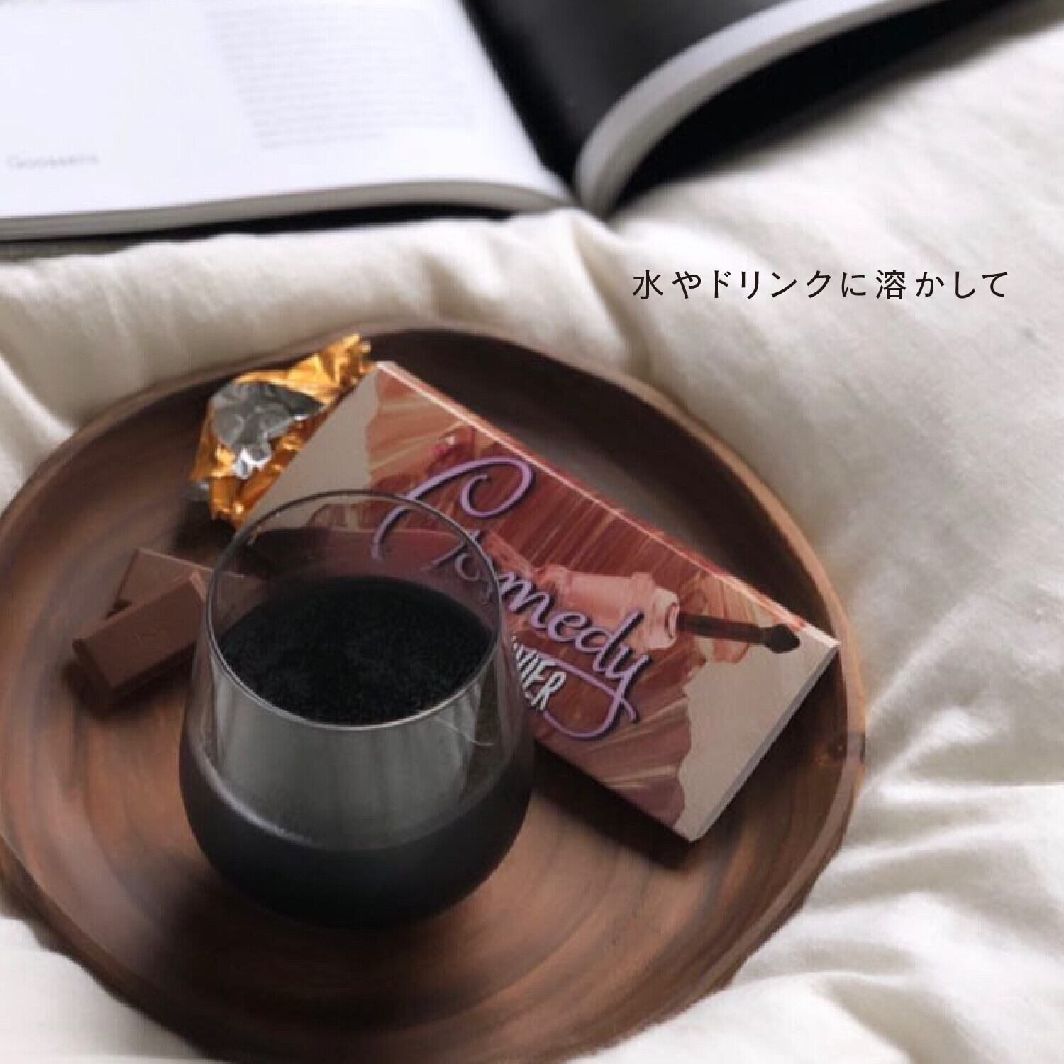 その他飲み物、和菓子、冷菓、クリームや麺類などに混ぜ、手軽に色味のアクセントを楽しめます。また、歯磨き粉に混ぜれば麻炭パウダーの吸着力で 汚れやニオイの原因となる物質を吸着・除去し口内環境がスッキリします。