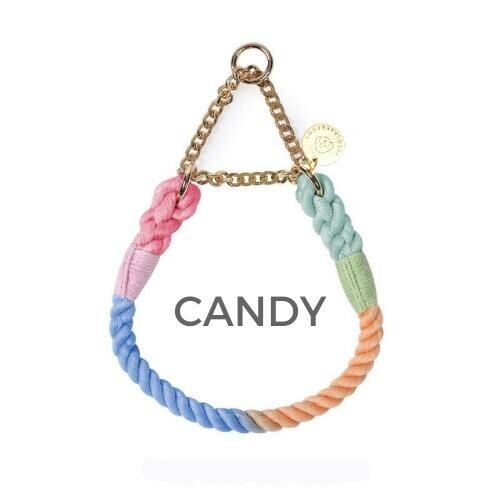 ハーフチョークタイプのロープ首輪です。柔らかいロープ素材と、頭からさっとかぶせるだけの手軽さが魅力です。わんちゃんが引っ張るとチェーン部分が締まり、引っ張り癖のあるわんちゃんにお散歩マナーを教えるのに最適です。ロープ部分は締まらないので、より安全にご利用いただけます。